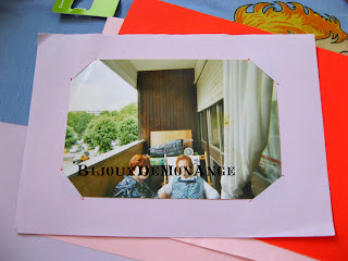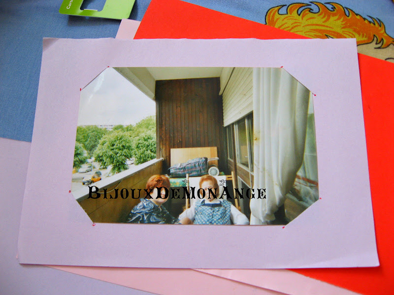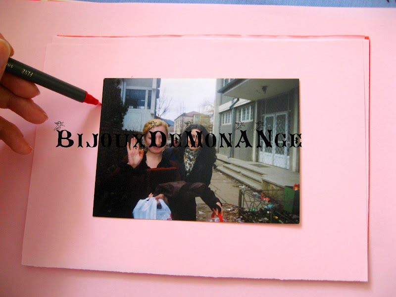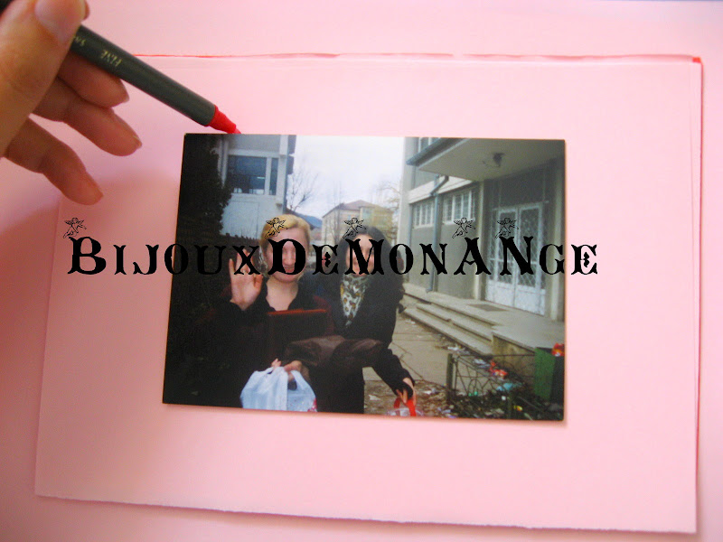Asezam fotografia pe jumatatea de coala in pozitia dorita, si cu pixul/creionul marcam puncte pentru fiecare colt al pozei, la 2 cm distanta pe fiecare latura. Acestea vor fi capetele taieturii. Eu am ales sa le pozitionez drept, puteti sa le faceti si inclinat.