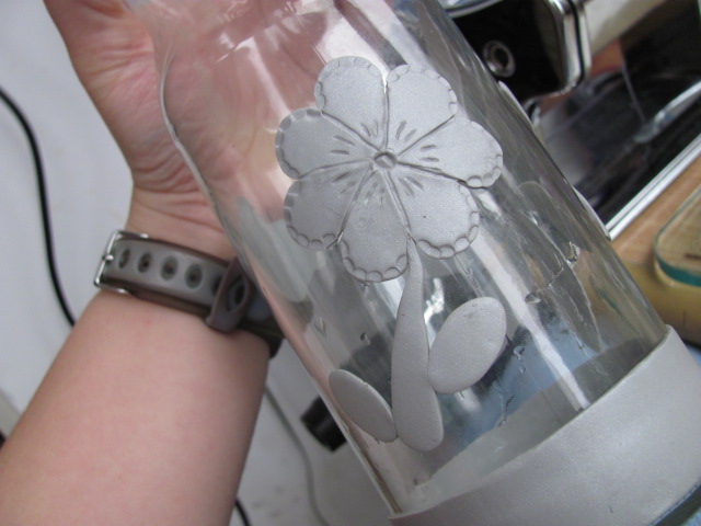 Dupa ce s-a racit sticla puteti sa o decorati in continuare, folosind un aparat de gravare sau puteti sa o lasati asa, e alegerea fiecaruia. Eu am gravat cateva decoratii in plus cu ajutorul unui “Engrave-it”, aparat cumparat de la un magazin de “totul la 3,9 lei”: