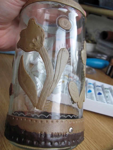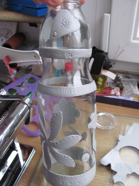 Dupa ce am facut toate modelele si imprimarile dorite, sticla este gata de coacere. O veti pune la cuptor si o veti coace la temperatura si timpul indicat pe pachetelul de lut polimeric folosit (la Sculpey am lasat-o 30 de minute la temperatura de 130-150 grade Celsius).